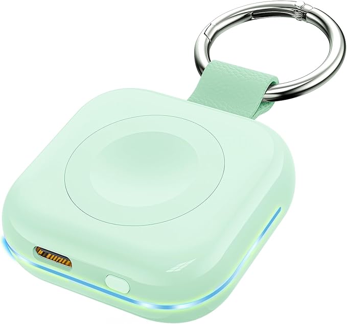 This portable charger compatible with Apple Watch Series 10 9 8 7 6 5 4 3 2 1 SE Ultra 2 Ultra 49mm 46mm 45mm 44mm 42mm 41mm 40mm 38mm. You can choose the charging method that suits your needs for more convenience and speed. Magnetic Power Bank for Wireless Charging and Built-in 1200 mAh battery offers 1-1.5 times of charge for your watch, Magnet design enables the apple watch charger to align correctly and start charging instantly once the magnetic charger gets close to the back of the iWatch. Charge your iWatch wherever and whenever you want without connecting to cables. This power bank built with a Type-C port for both input. The size of the cute keychain portable charger for apple watch is about the size of your watch. The comfortable frosted feel makes people love it. New indicator light design(0-30% Red Light,30%-60% Blue Light,60%-100% Green Light), fashion, keychain design, Convenient for all kinds of travel. Portable iWatch power bank is designed with over current, over voltage, short circuit and over heat protection. Provide a convenient and safe charging environment for your family, ensuring stable and fast charging of iWatch and charger. Also the portable Apple Watch charger provides a Type -C cable for quick charging of the charger.